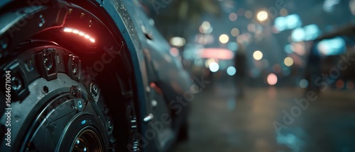 Fototapeta premium Futuristic Vehicle Wheel with Neon Lights and Urban Background