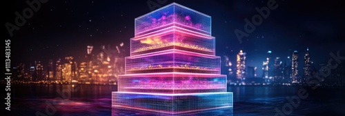 © P, Fototapeta premium Futuristic vertical farm hologram at night with cityscape