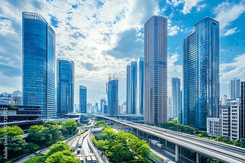 Obraz premium Futuristic view of a city with high-rise buildings and modern towers,...