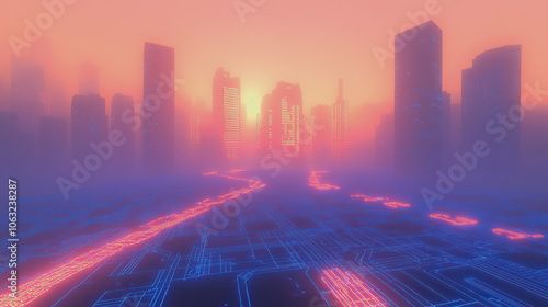 Fototapeta premium Futuristic Virtual Circuit Landscape at Dusk