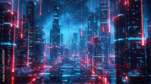 Fototapeta premium Futuristic virtual cityscape with digital avatars. Metaverse technology...