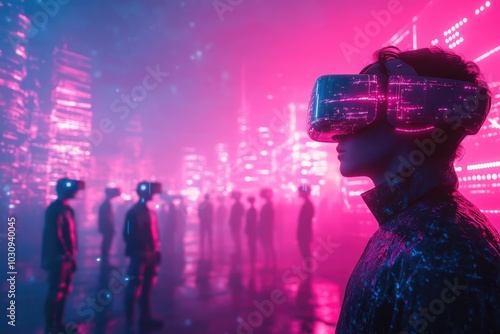 Fototapeta premium Futuristic Virtual Reality: Neon Cityscape and Immersive Technology