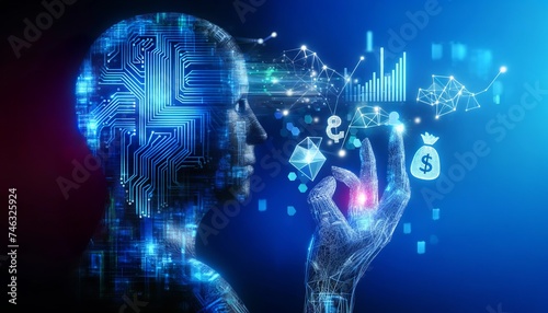 © Czintos Ödön, Naklejka premium Futuristic visualization of finance and technology with a holographic human head and hand interacting with digital currency and data symbols.AI generated.