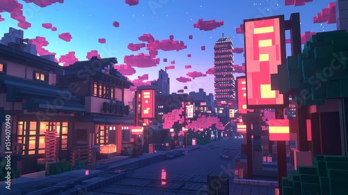 Obraz premium Futuristic Voxel City at Shibuya Crossing with Holographic Effects and Cherry Blossoms