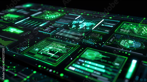 © Ali, Fototapeta premium Futuristic wallpaper featuring floating panels of data with virtual elements, green code strings, and holographic light effects against a black background.