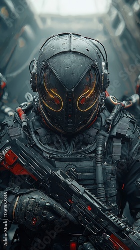 Fototapeta premium Futuristic Warrior in Armored Suit with Advanced Weaponry and Detail