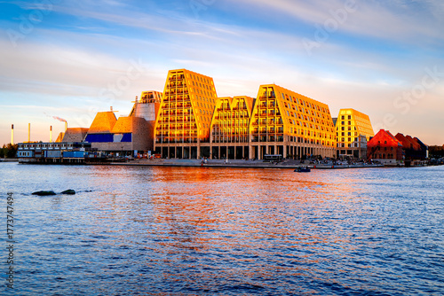 © Tomasz, Fototapeta premium Futuristic waterfront apartment buildings (Papirøen København) in golden light sunset, Copenhagen, Denmark. Contemporary Scandinavian architecture.