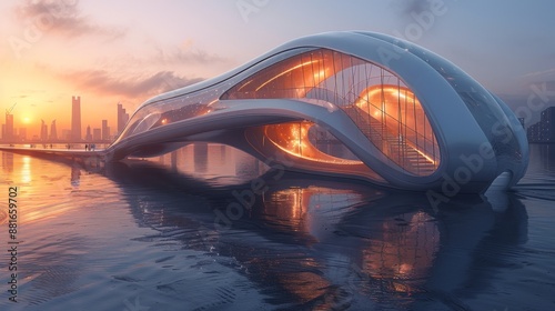 Obraz premium Futuristic Waterfront Building at Sunset - Generative AI