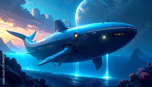 © Yogi, Fototapeta premium Futuristic Whale-Shaped Spaceship Soaring Over Alien Ocean