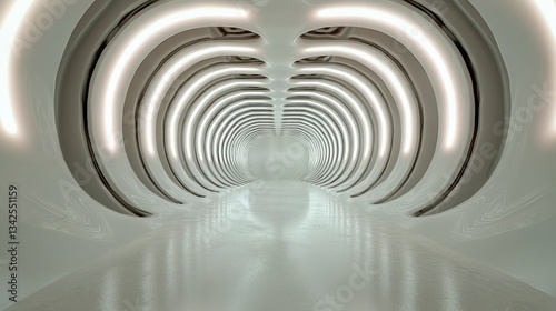 © Oat_Photo, Naklejka premium Futuristic White Corridor Abstract Geometric Tunnel Modern Architecture AI Generated In