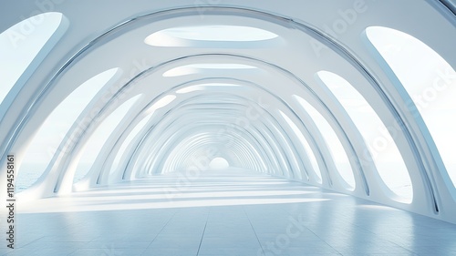 © Barracuda Atelier, Obraz premium Futuristic white corridor, ocean view, architecture, design