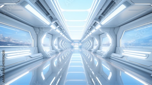 © MINHO, Fototapeta premium Futuristic White Corridor with Cityscape View