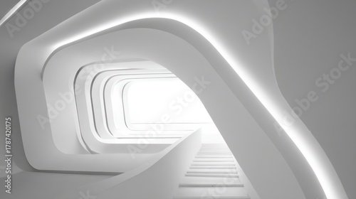 © Nurul, Fototapeta premium Futuristic white interior featuring organically curved walls, a bright light source at the end of a corridor, with gentle lighting enhancing the forms