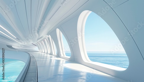 Obraz premium Futuristic white interior hallway with oval windows overlooking the ocean on a sunny day