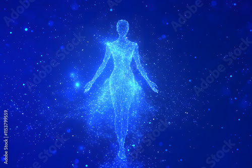 Fototapeta premium Futuristic Woman Silhouette with Glowing Particles and Digital Network Dress...