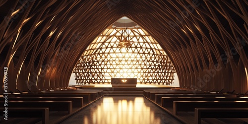 Obraz premium Futuristic Wooden Lattice Church Interior with Arched Ceiling and Ambient...