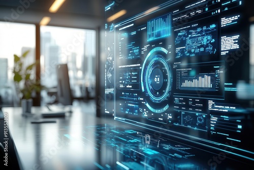 Obraz premium Futuristic workspace featuring advanced data analytics on a digital interface, showcasing technology and innovation.