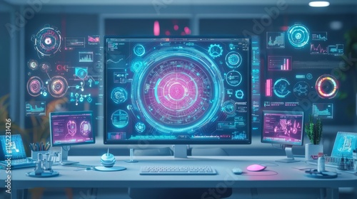 Obraz premium Futuristic workspace with advanced digital interface and data visualization...
