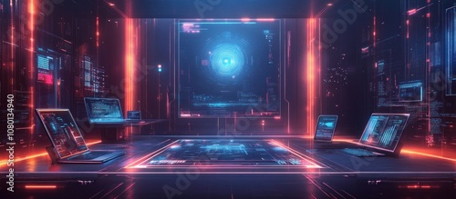 © ROY, Obraz premium Futuristic workspace with glowing screens.