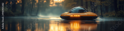 © DmitrySergeevich, Obraz premium Futuristic Yellow Watercraft Gliding on a Serene Lake Surrounded by Pine Trees at Sunset