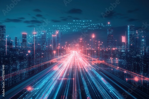 Fototapeta premium Futuristische Stadt Skyline Cyberpunk Nachtansicht Smart City Konzept Moderne Fahrzeuge Vernetzte Infrastruktur Drohnenverkehr Hightech Verkehrswege Beleuchtete Stadt Digitales Stadtbild Zukunftstechn