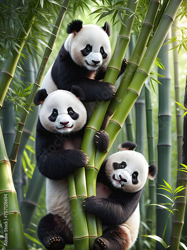 © EVISUAL, Obraz premium Fuzzy Climbers: Red Pandas Frolic in Lush Bamboo Forest. generative AI