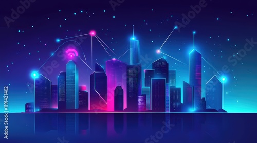 © Agnieszka, Fototapeta premium 5G smart city night skyline with digital connections and neon lights