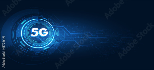 © BeNeDak, Naklejka premium 5G speed internet futuristic technology background with circuit board and light.Network electronic vector design.