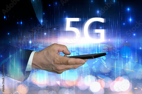 © jittawit.21, Fototapeta premium 5 G wireless high speed Internet access. Businessman enters the high-speed world.