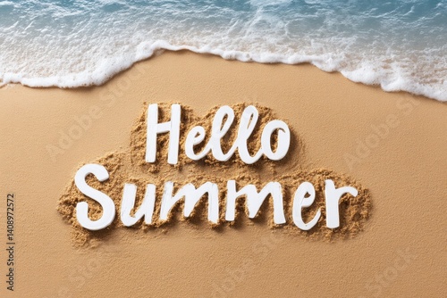 © Diffin, Fototapeta premium G written in sand on a beach with an incoming wave, Hello Summer background.