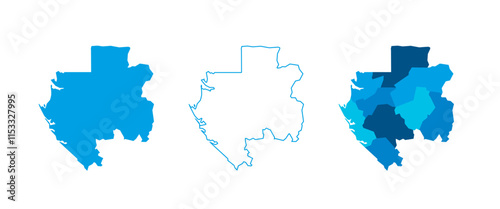 © pyty, Obraz premium Gabon set of three maps - solid map, outline map and map highlighting administrative divisions. Three distinct maps illustrate various representations of a geographical area.