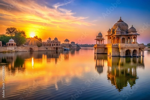 © Arnada, Fototapeta premium Gadi Sagar Lake, Jaisalmer, Rajasthan, India: Stunning Bokeh Sunset