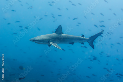 © Maria, Fototapeta premium Galápagos-Hai schwimmt mit Begleitfisch im blauen Ozean