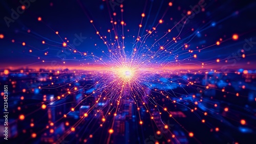 Obraz premium Galactic Cityscape at Dusk - Vibrant Neural Network Visualization