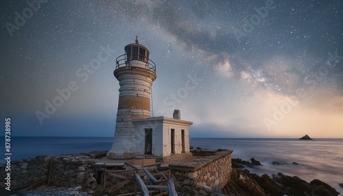Naklejka premium Galactic Glow: Night Photography Captures a Lone Lighthouse and the Starry...