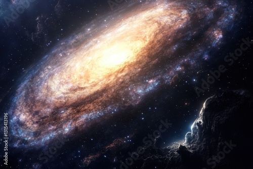 © YouraPechkin, Obraz premium Galactic spiral structure illuminated by bright stellar formations in deep space