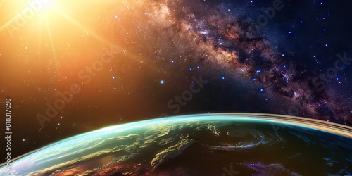 Obraz premium Galactic Symphony: Milky Way Over Vivid Planet and Luminous Rings