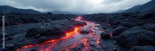 © tpadobestock, Naklejka premium Galapagos lava flow with volcanic rocks and ash, earthy tones, geological formation, natural wonder