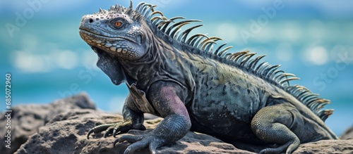 Fototapeta premium Galapagos marine iguana on volcanic rocks copy space image
