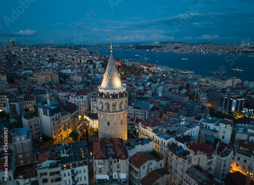 Naklejka premium Galata Tower in the Sunset Lights Drone Photo, Galata Beyoglu, Istanbul Turkey