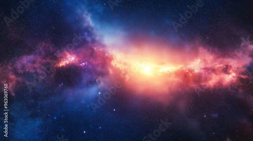 © Anthichada, Obraz premium Galaxy exploration through outer space towards glowing milky way galaxy. glowing nebulae, clouds and stars field. Background