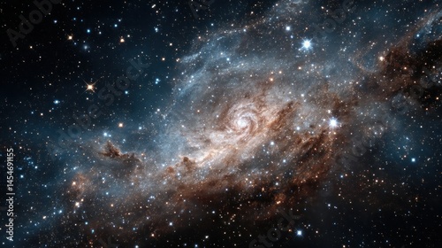 Naklejka premium Galaxy swirls in cosmos, starlight amidst cosmic dust clouds