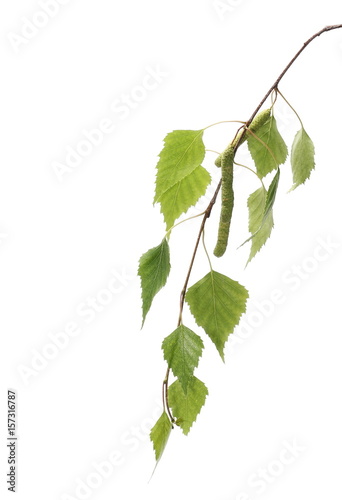 © dule964, Fototapeta premium Gałązka bazi brzozy, łodyga betula pendula ament, młode liście wiosny, na białym tle