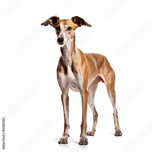 © Toseef, Obraz premium Galgo espaol dog breed standing against white background, AI Generated