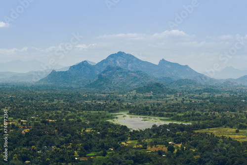Naklejka premium Galkoth Kanda, Erawulagala, Dikkandahena mountains and Kayanwala lake view from Sigiriya rock, Sigiriya, Sri Lanka.