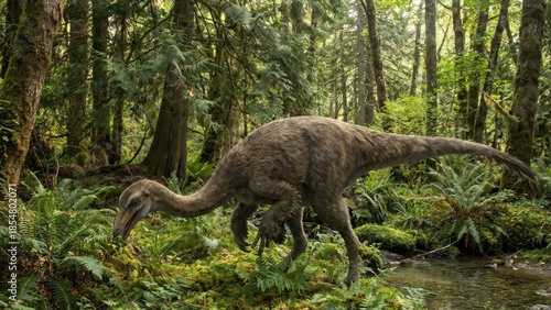 © flashmovie, Obraz premium Gallimimus dinosaur walking near a stream in a dense, lush prehistoric forest, illustrating ancient wildlife and extinct species in a natural, historical environment