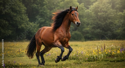 © Fan_, Obraz premium Galloping Brown Horse Running Freely in a Sunny Meadow with Flowers