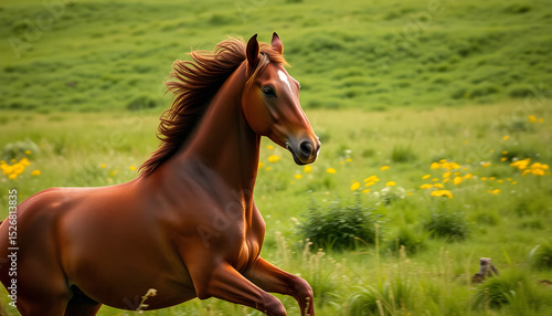 Obraz premium Galloping horse in a meadow nature photography vibrant green landscape...