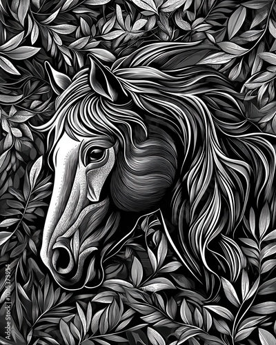 Obraz premium galloping horse with flowing mane tattoo, surrounded by leaves, in detailed woodcut style sketch engraving generative ai raster illustration. Scratch board imitation. Black and white image