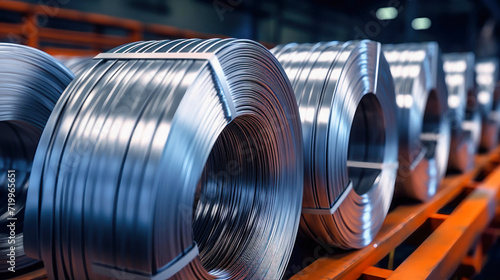© Anoo, Obraz premium Galvanized steel rolls inside a factory or warehouse. Metallurgical production. Sheet metal for stamping. Selective focus.